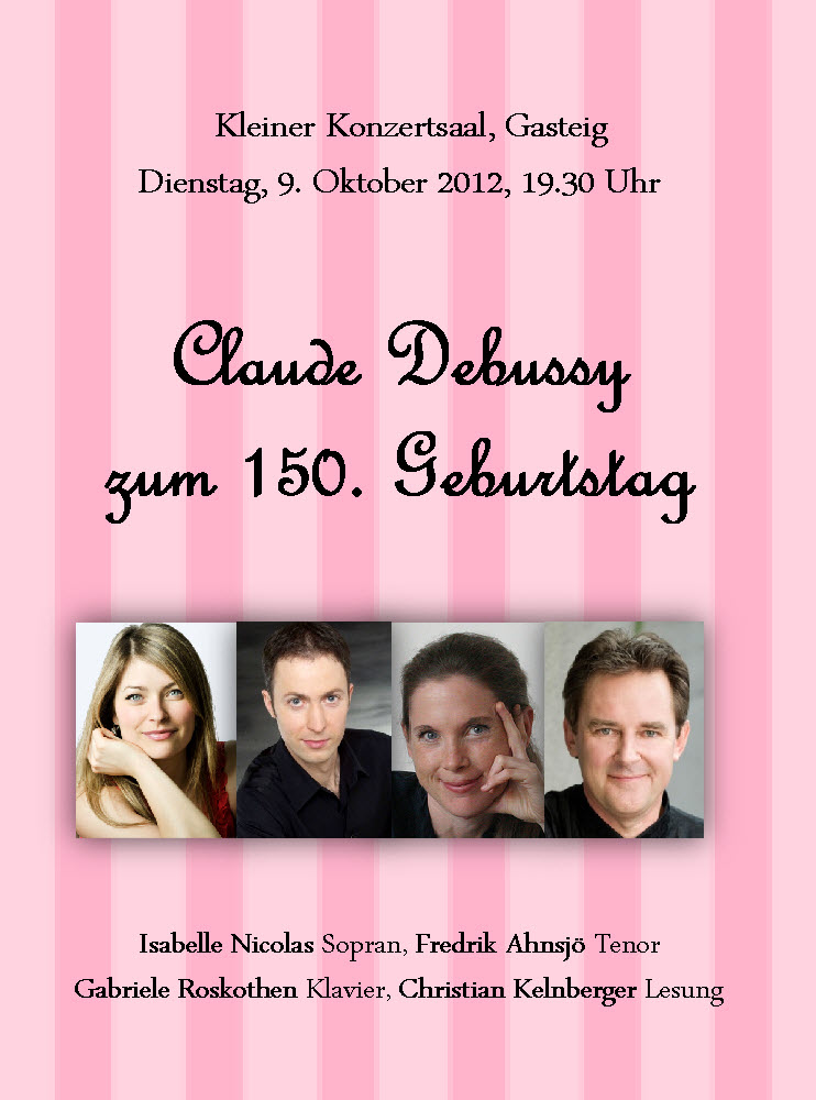 Wir werden Einblicke in das spätromantische Liedschaffen Claude Debussys und seiner Zeitgenossen Gabriel Fauré, Henri Duparc und Ernest Chausson geben. Briefen des Komponisten werden gelesen sein.